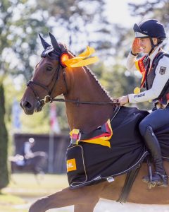 Der BMLEH-Tierschutzpreis, ein Sonderehrenpreis für besonders pferdegerechtes Reiten des Bundesministeriums für Landwirtschaft, Ernährung und Heimat (BMLEH) wurde im Rahmen des Finales der fünfjährigen Vielseitigkeitspferde an Felicia von Baath auf Novia vergeben. fn-press/Jessica Kaup