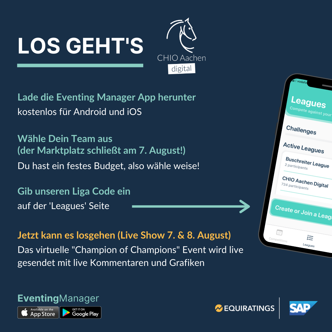 Neben unserem Preis gibt es weitere tolle Preise für die Teilnehmer. Der Spieler mit dem besten Team gewinnt 2 Karten für den CHIO Aachen 2021 als Gast bei SAP.