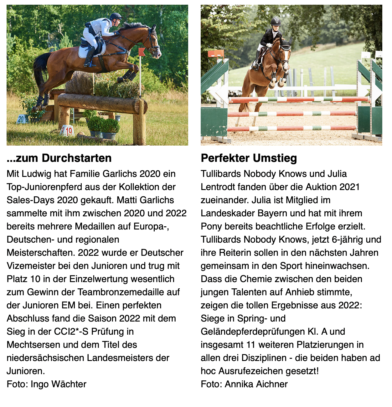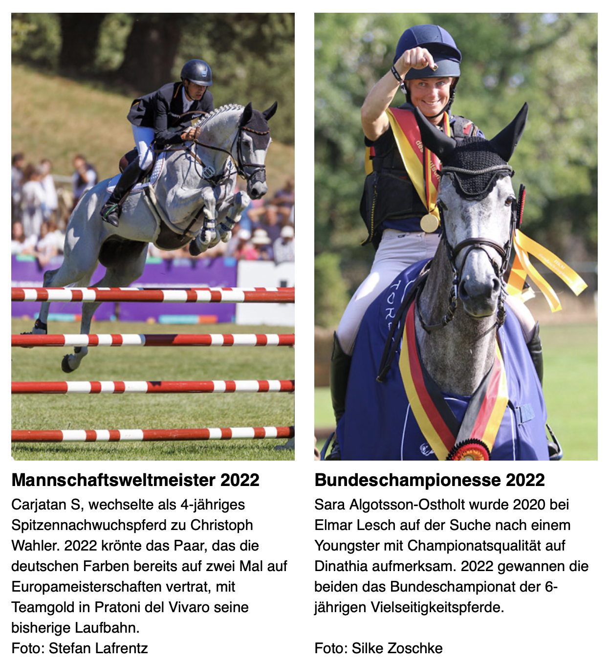 Sowohl Profireiter als auch Nachwuchtalente und Amateure finden ihre passenden Sportpartner bei Elmar Lesch – entweder auf der Auktion, aber auch über die Verkaufstage oder auf Anfrage, hier einige 2022 im Sport hocherfolgreiche Beispiele: