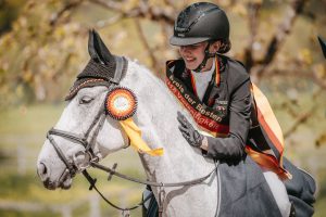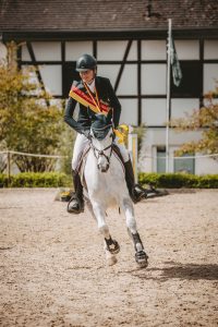 Gleich zwei goldene Schleifen konnte Teresa Leowald mit ihrem sprungewaltigen Schimmel DJ Continus (Züchterin: Claudia Eckhoff; Besitzer: Karl Schneider) an diesem Wochenende mit nach Hause nehmen. Zum einen gewann die Rheinländerin mit ihrem Dressurergebnis von -28,1 Punkten die CCI2*-S Prüfung mit 85 Teilnehmenden, zum anderen konnte sie mit diesem Ergebnis auch die Siegerschärpe in der Preis der Besten Wertung der Junioren in Empfang nehmen. Für den Diacontinus-Sohn und seine 17-jährige Reiterin war es bereits der zweite CCI2*-S Sieg. Im vergangenen Jahr gewann Teresa am gleichen Ort mit ihrer Ponystute Pearl noch Bronze beim Preis der Besten der Ponyreiter.