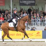 Mit nur 1,8 Punkten Abstand zu Michael Jung rangiert die Britin Laura Collett momentan auf Rang zwei. Die Reiterin präsentierte ihren mehrfachen Fünf-Sterne-Sieger London 52 gewohnt ausdrucksstark. Ein paar kleine Unstimmigkeiten, wie zum Beispiel ein Stocken in der Linkstraversale, verhinderten heute eine noch bessere Benotung für das erfahrene Paar: „Normalerweise sind die Traversalen eines seiner Highlights. Ich habe an der kurzen Seite etwas zu viel riskiert und ihn vor der Linkstraversale nicht rechtzeitig genug wieder aufgenommen. Deswegen kam es da zu einem kleinen Missverständnis. Ich habe London 52 heute absichtlich etwas mehr auf Angriff geritten, um herauszufinden wie viel wir riskieren können. Ich weiß, dass ich ihn jederzeit auf Sicherheit reiten kann. Wir wollen es aber schaffen, viel zu riskieren und dabei trotzdem fehlerfrei zu bleiben. Man muss ab und an mal etwas ausprobieren, um die perfekte Balance zu finden. Die Galopptour und die Mittellinien waren heute sehr gut, da hat alles so geklappt, wie wir uns das vorgestellt haben.“