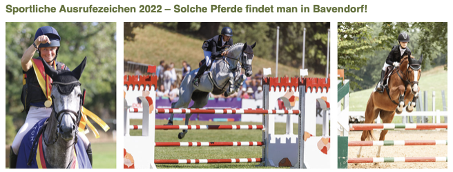 Die Youngster und Berittpferde, die von meinem Team und mir in diesem Jahr trainiert und auf Turnieren vorgestellt wurden, haben uns viel Freude bereitet, mehrere von ihnen sind mittlerweile bei neuen Besitzern. Ihren Käufern/Reitern wünschen wir mindestens genauso viel Freude, aber vor allem ganz viel Glück und Erfolg auf ihrem weiteren sportlichen Weg. Ich würde mich sehr freuen, wenn der ein oder andere Kandidat aus den Reihen unserer Ausbildungspferde oder aus den Kollektionen der diesjährigen Sales-Days bzw. Eventer-Auction die „Galerie der sportlichen Ausrufezeichen 2023“ mit Erfolgsmeldungen aus der kommenden Saison bereichert. Ein Klick auf den nachfolgenden Link zeigt aktuelle Referenzen und verdeutlicht die Bandbreite bzw. die Qualität, die man als Käufer in Bavendorf erwarten darf: